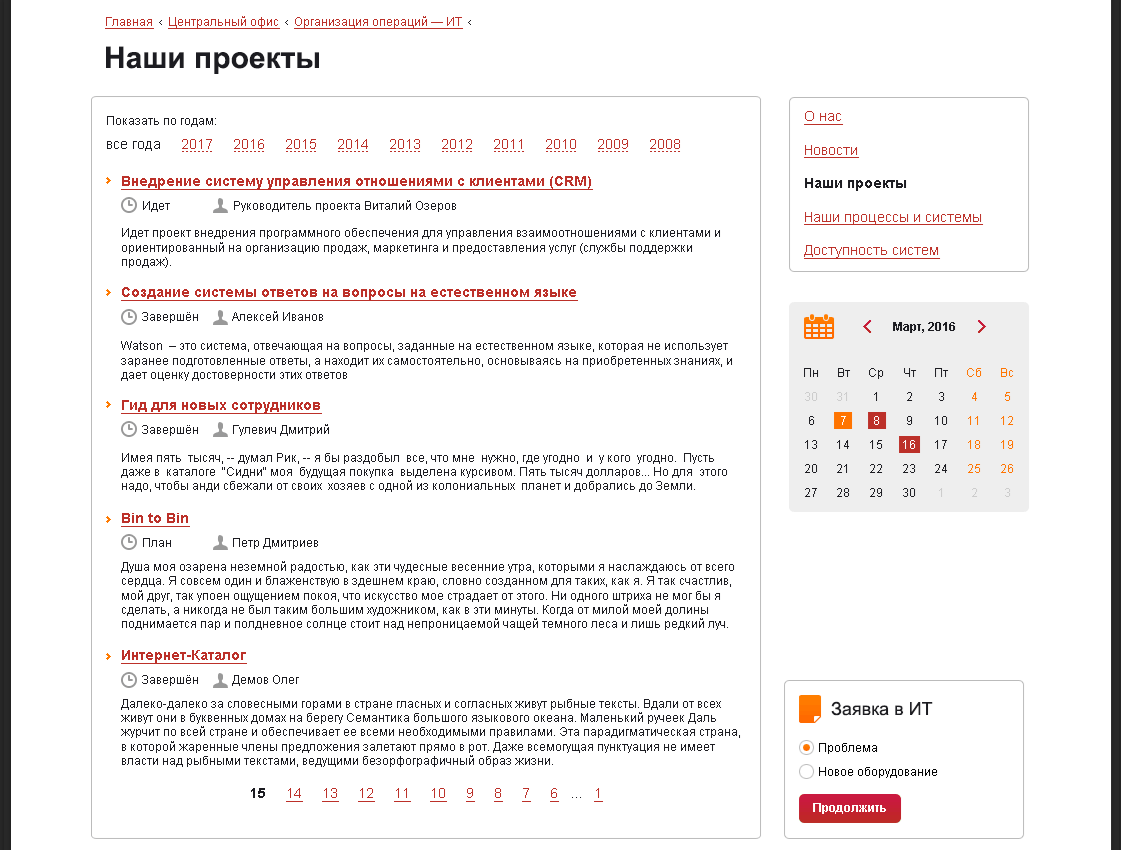 Раздел позволяет всем сотрудникам компании увидеть информацию о проектах, которые курирует ИТ департамент