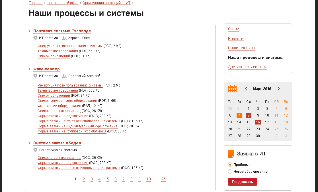 Раздел позволяет получить описание и документацию по различным процессам и системам, которые ведет и сопровождает ИТ департамент. Возможна интеграция с базой знаний компании.