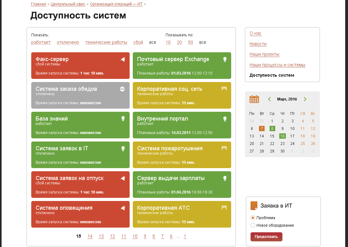 Раздел позволяет планировать периоды отключения, обслуживания и обновления информационных систем. Сотрудникам можно заранее знакомиться с плановыми периодами обслуживания и временем включения отключенных систем. Плановые события ведутся администратором портала или выполняется интеграция с системой планирования. Для мониторинга ключевых сервисов возможна интеграция со специализированной системой, например Zabbix или MS System Center.