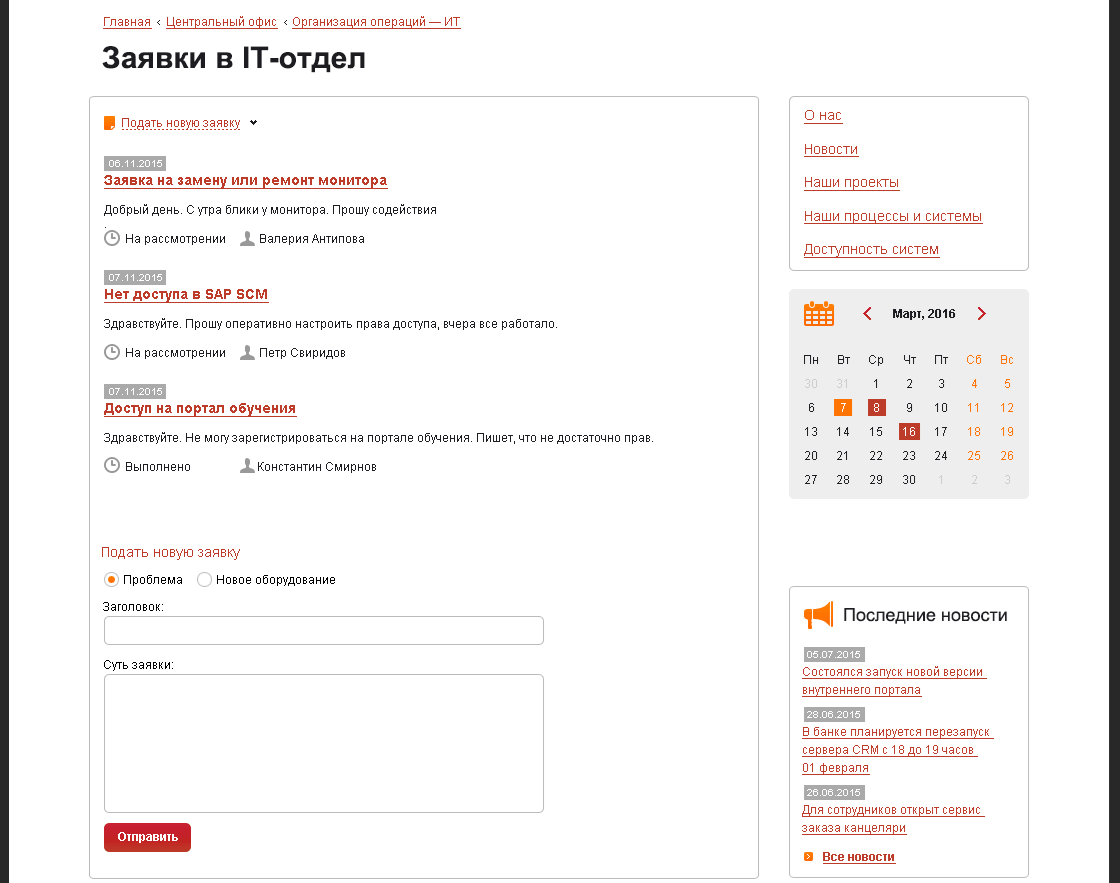 Раздел новостей позволяет всем сотрудникам знакомиться с событиями ИТ департамента. Возможна интеграция с новостным сервисом компании.